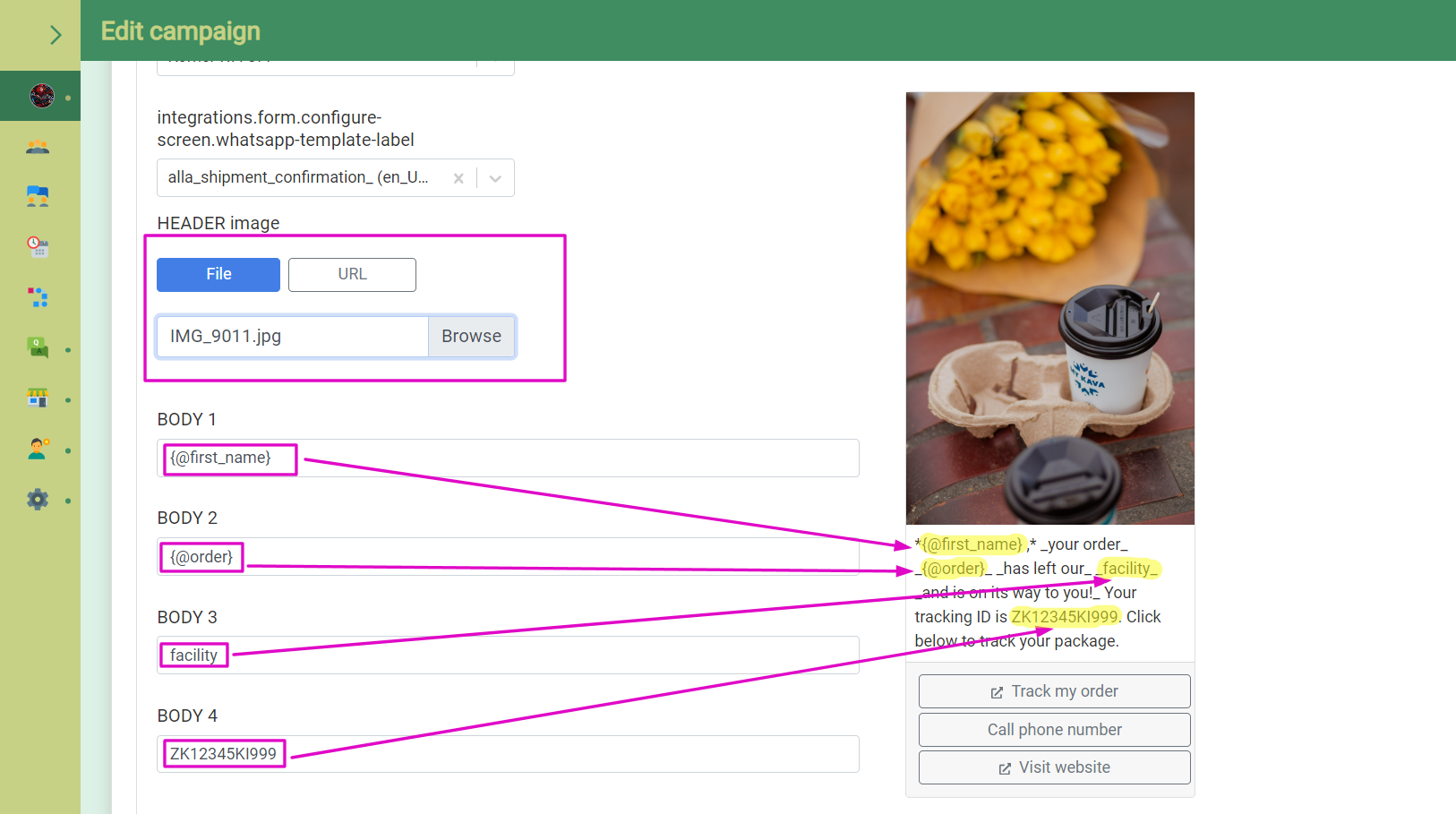 • Ha a sablon u.n. változókat tartalmaz, az azok által reprezentált adatok, automatikusan megjelennek a Szövegtörzsben (Body). A szövegtörzs szövege szabadon átírható, vagy átadható chatbotból érkező változóként. Egy változó sematikus szintaxisa a következő pl.: {@first_name}
