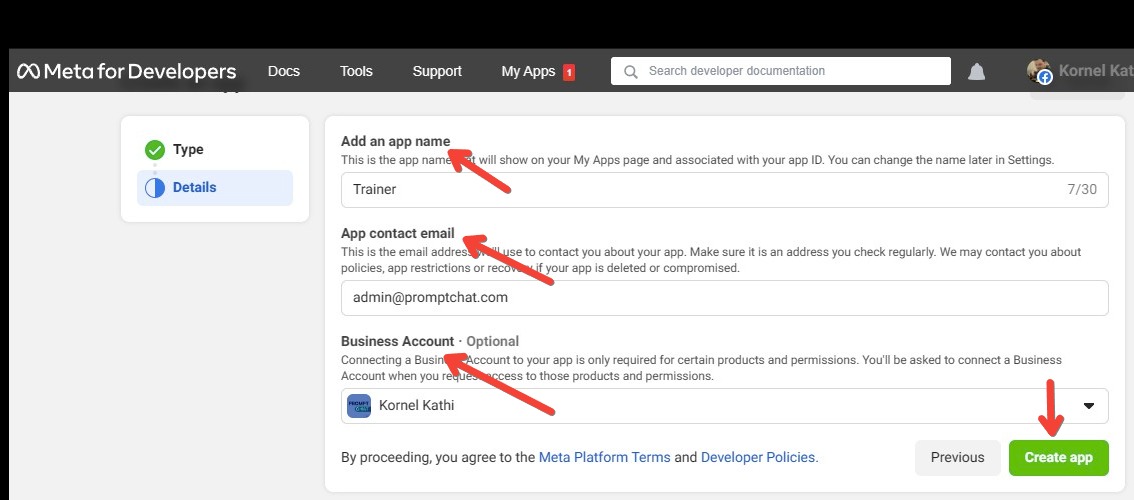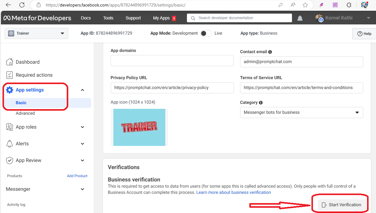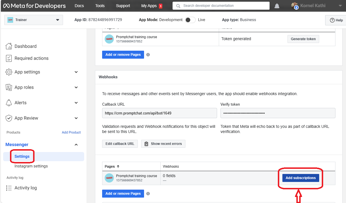 Másolja ki a Callback URL‑t és a tokent a Promptchat felületéről, majd illessze be a FB beállításokba