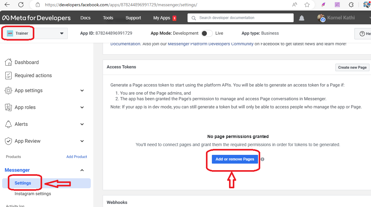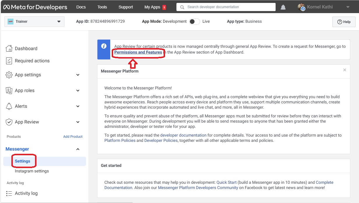 Lépjen a Messenger / Beállítások menüpontra, ahol megtalálja az Integrációhoz szükséges tokent.