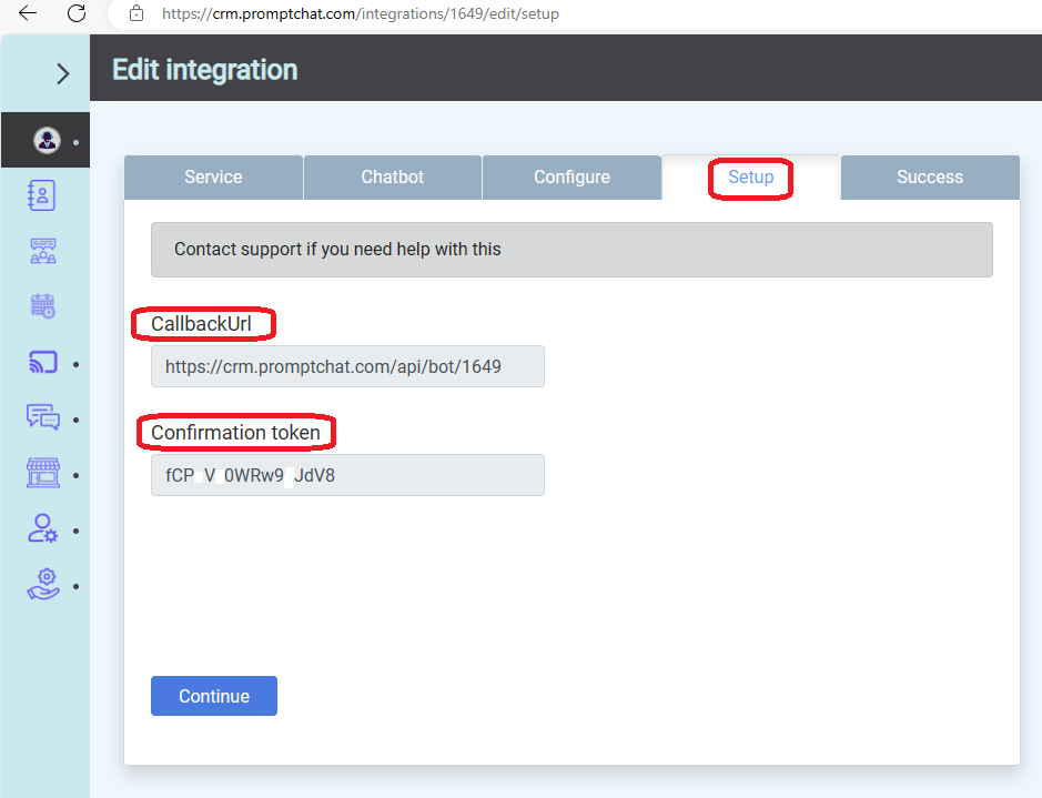 Folytassa az Integráció beállítását a Promptchat felületén, az innen származó adatok felhasználásával.