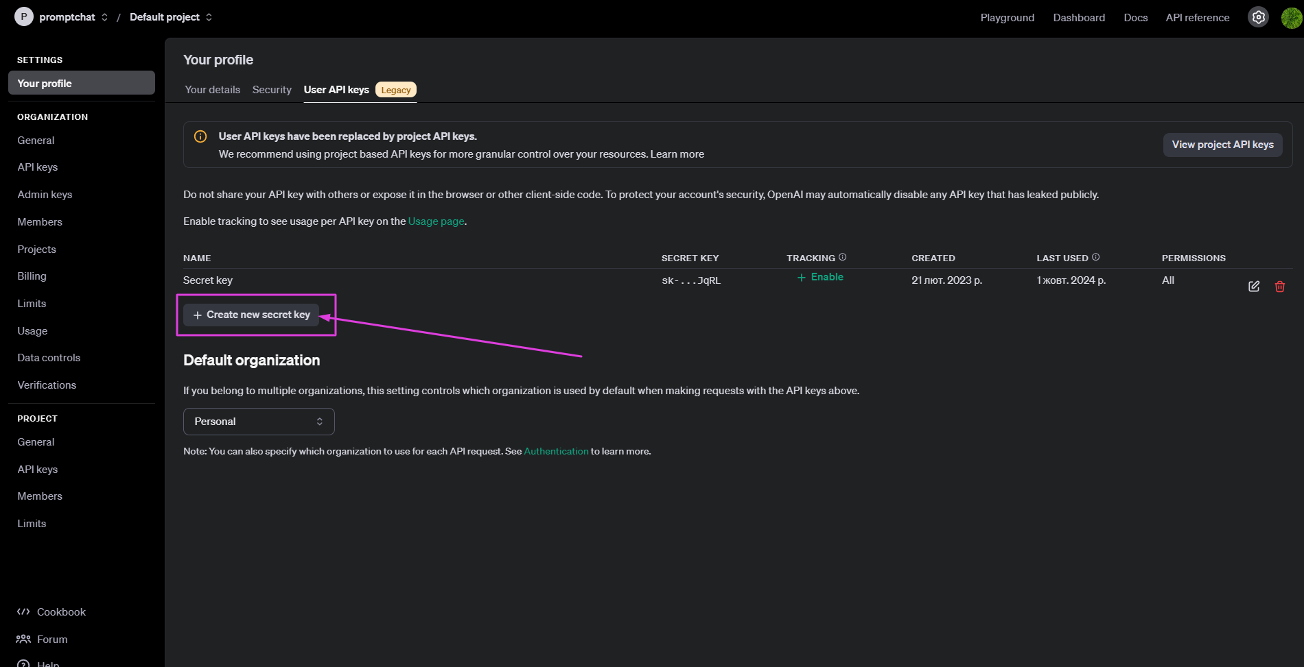 Ezt követően az OpenAI platformon kell beállításokat végezni. A platformon történő regisztráció és a profil oldalon az API-kulcs létrehozása után lehetőség nyílik az API kulcs generálásához.