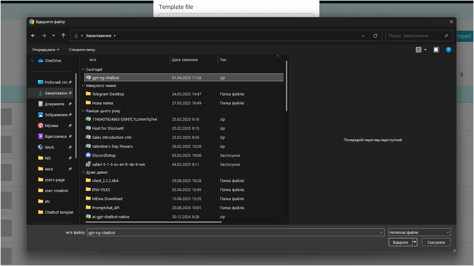 - The selected template will appear in the modal window. Click the "import" button to complete the process.