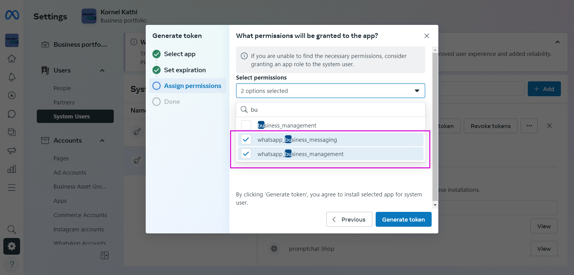 - On the next page, select the business profile you want to connect (optional, can be done later) and finalize the creation of your App by clicking the Create app button.